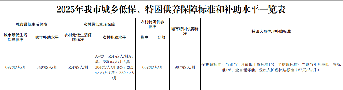 新乡市2025年城乡社会救助保障标准、补助标准一览表